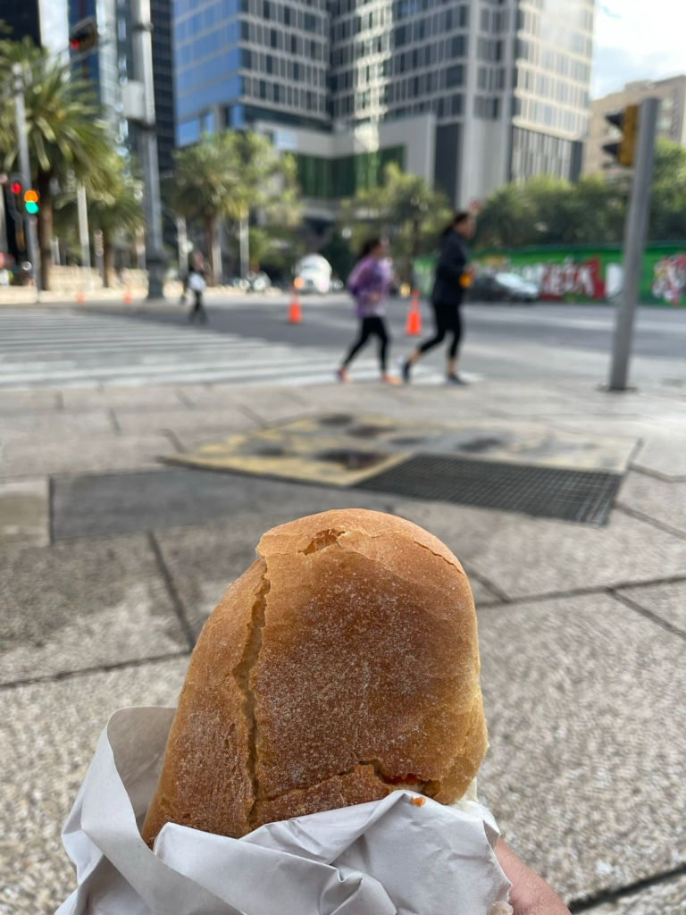 Todo era una pequeña dosis de adrenalina. La ciudad no se detenía, y nosotros tampoco. Cada minuto contaba, cada esquina era una postal fugaz. Pero el verdadero souvenir, el que sintetiza el sabor de este viaje, me lo encontré en una esquina cualquiera, en un puesto humeante: una torta de tamal. Ese manjar callejero, tan absurdo como delicioso. El tamal, rojo y tierno, se refugiaba entre los bollos de la telera, y al morderlo, el vapor se mezclaba con el aire. El primer bocado fue una epifanía: el sabor a masa y salsa roja se fundía con ese olorcito inconfundible a smog, a ciudad, a gasolina y asfalto. Era el platillo perfecto, el que encapsulaba el espíritu de la metrópoli: una combinación improbable, caótica, pero extrañamente reconfortante.